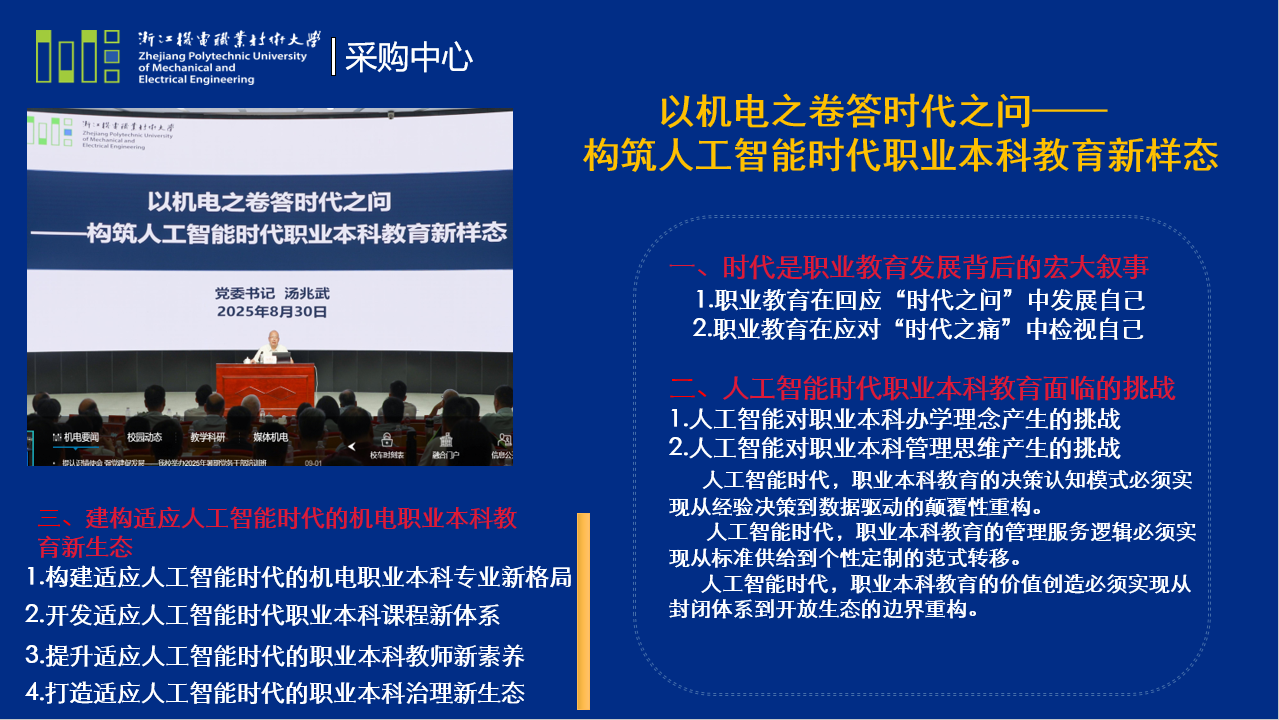 陈南宁副处长强调采购中心所有人员要立足人工智能时代的背景、立德树人的根本任务和学校职业本科教育高质量发展的需求,齐心协力、共同推进阳光采购、高效采购。