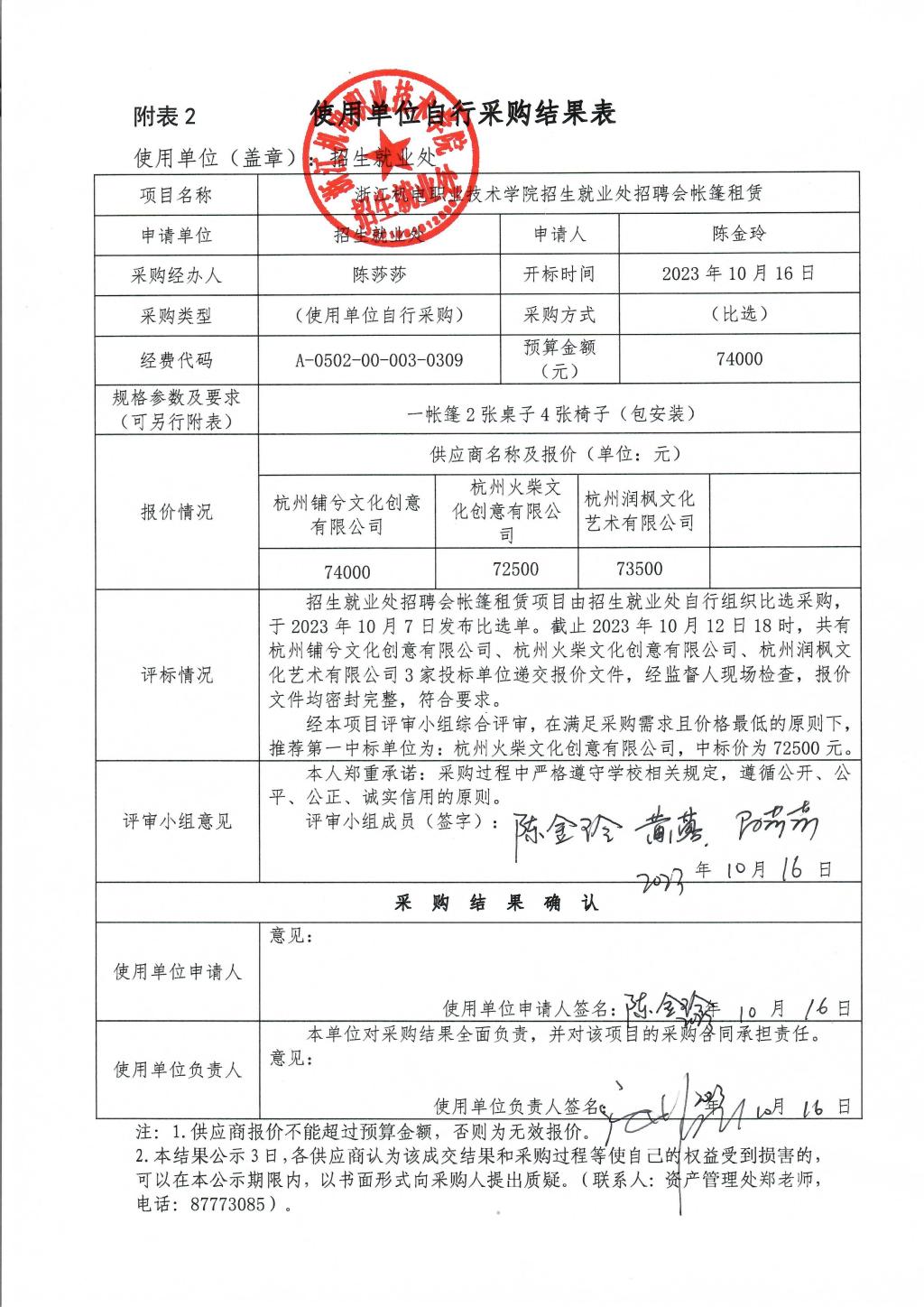 浙江机电职业技术学院招生就业处招聘会帐篷租赁结果公示