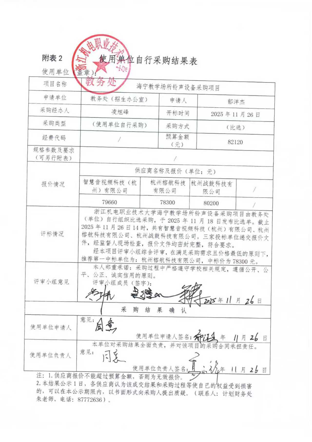 浙江机电职业技术大学教务处(招生办公室)-海宁教学场所铃声设备采购项目比选结公告