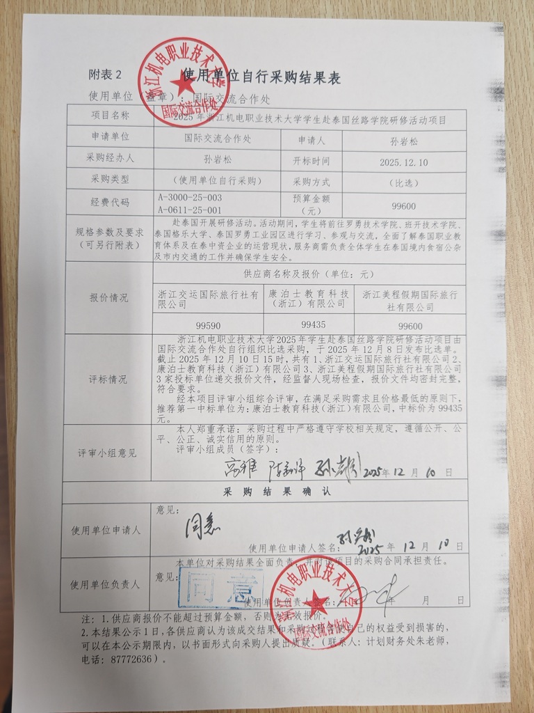 浙江机电职业技术大学国际交流合作处2025年度学生赴泰国丝路学院研修活动项目采购比选结果公示