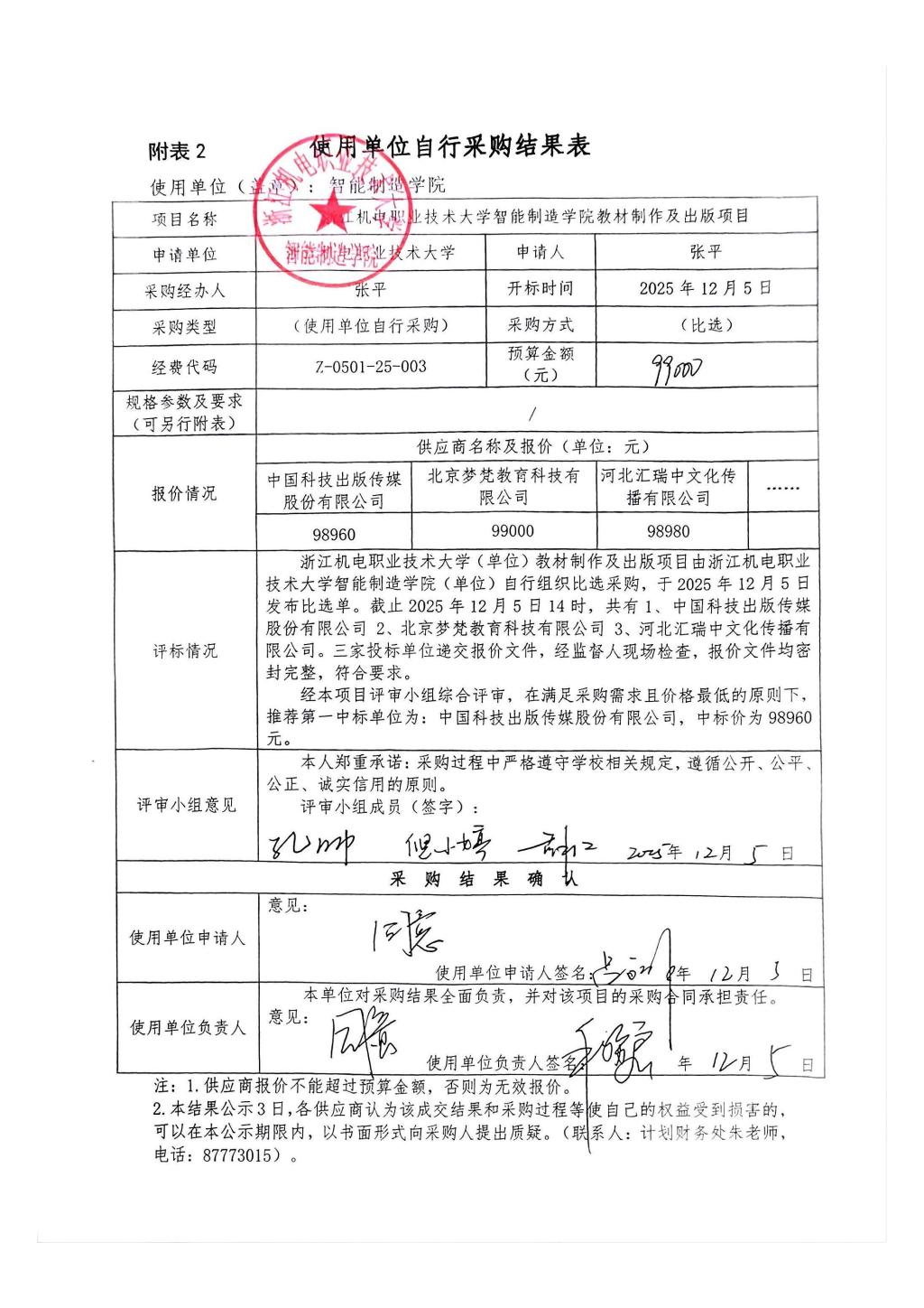 浙江机电职业技术大学智能制造学院学院教材制作及出版项目采购比选结果公示