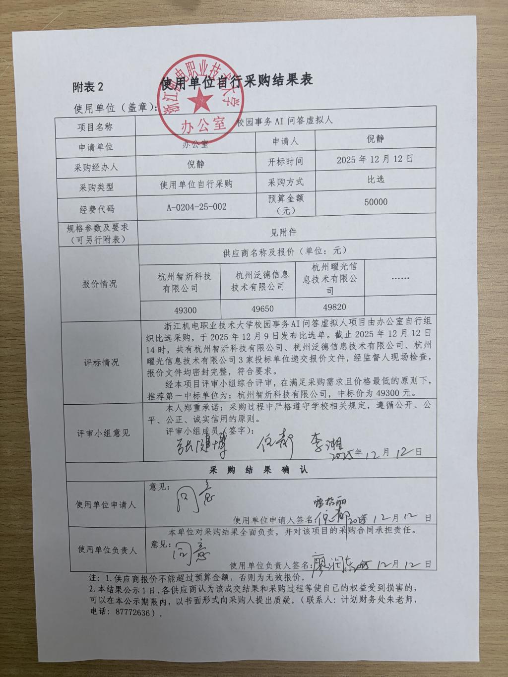 浙江机电职业技术大学办公室校园事务 AI 问答虚拟人服务采购比选结果公示