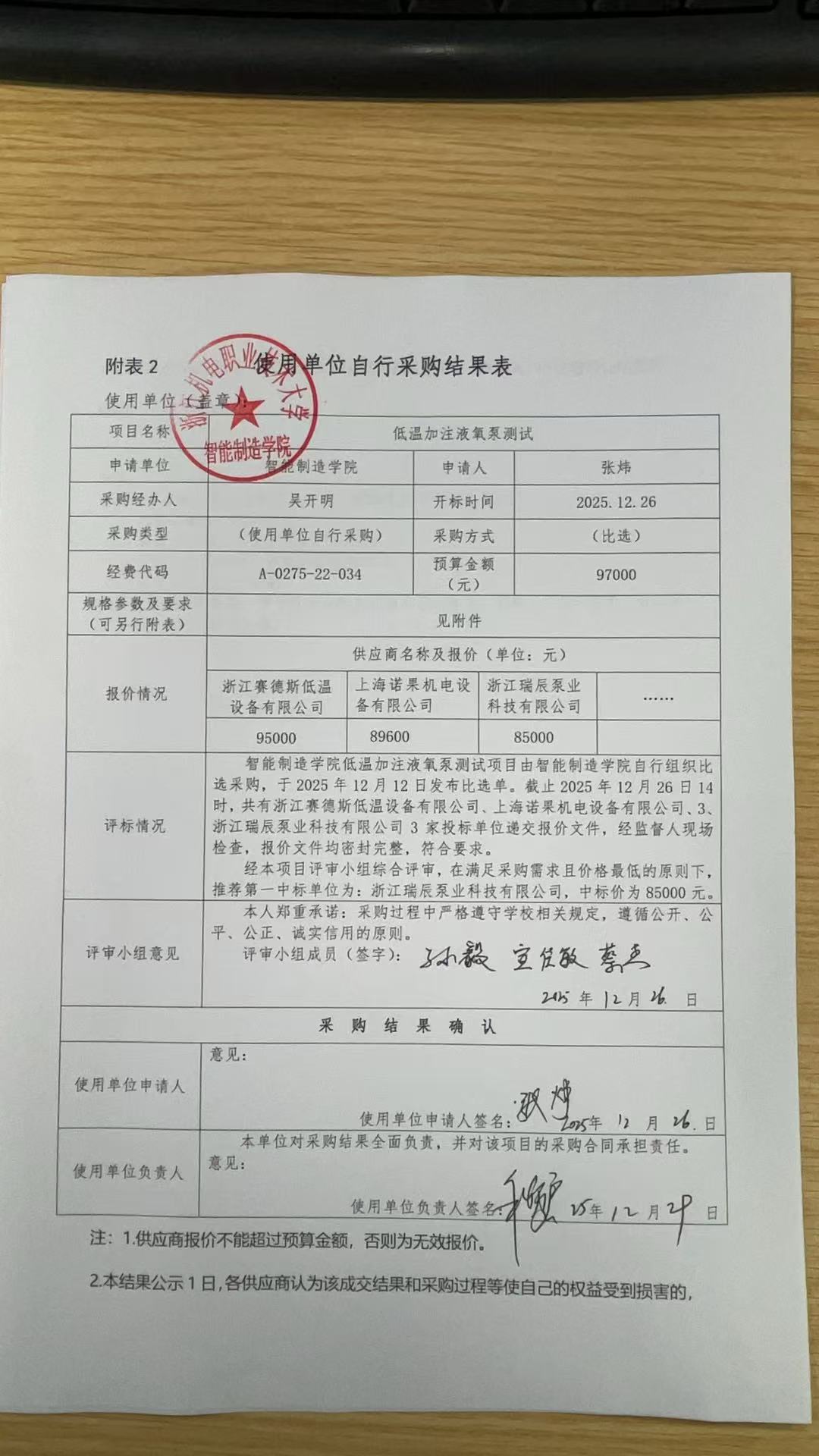 浙江机电职业技术大学智能制造学院低温加注液氧泵测试项目采购比选结果公示