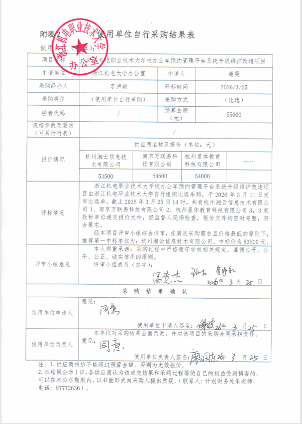 浙江机电职业技术大学校办公车预约管理平台系统升级维护改造项目结果公告